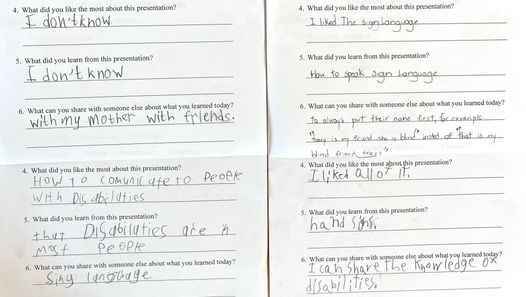 We reflected on the fact that all of us face challenges of some type at some point. We all know people who benefit from our kind and patient support. The students discussed how our society is better and stronger as a whole when we make an effort to be sensitive to peoples’ feelings and be alert to ways we can be allies to people who have disabilities.