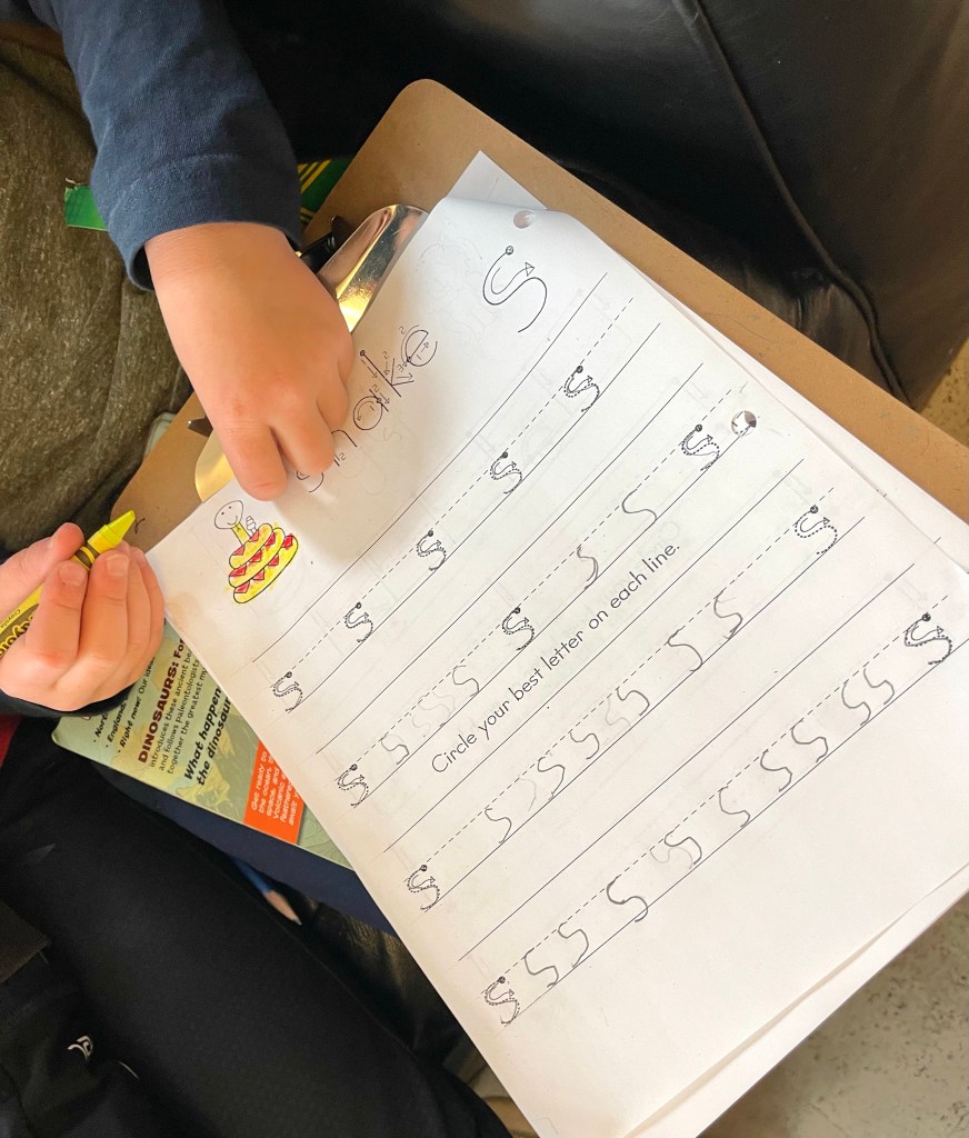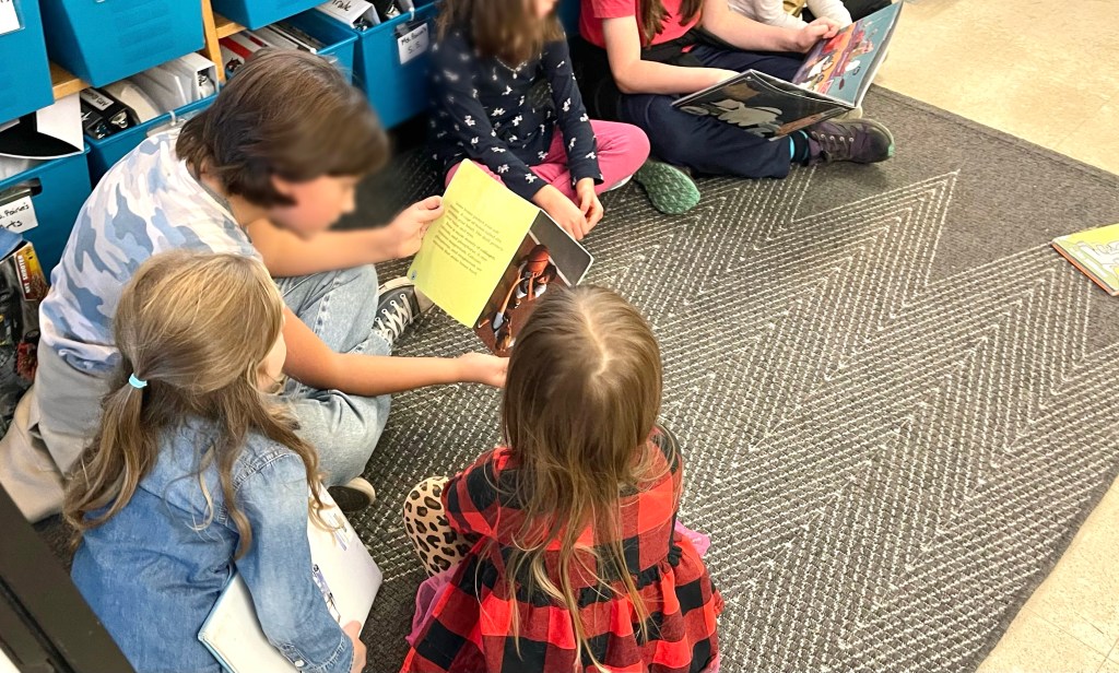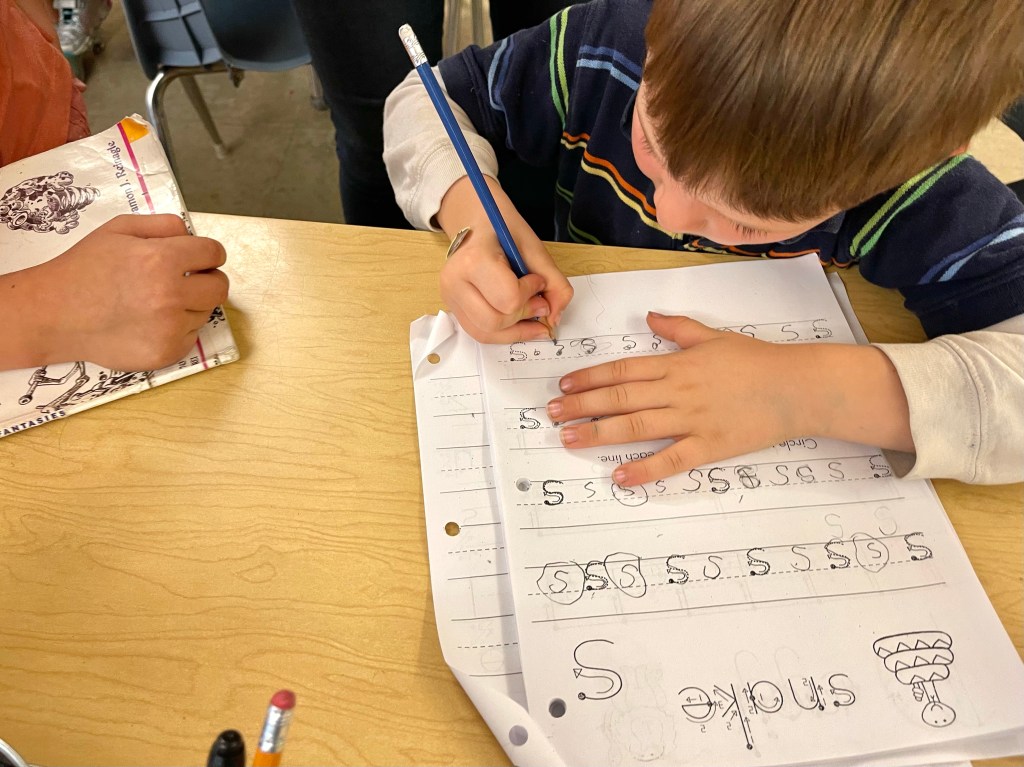 Division 4 students also enjoyed more time with their kindergarten buddies on Thursday. They read stories aloud, drew pictures with them, and helped them learn to follow correct printing procedures. This printing skills review was important for the older students to reinforce proper technique to form beautifully legible letters.