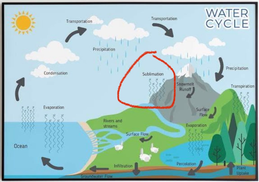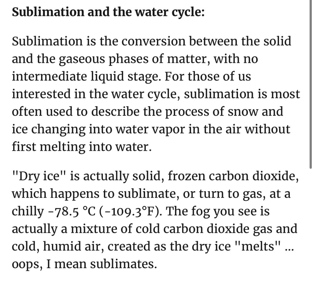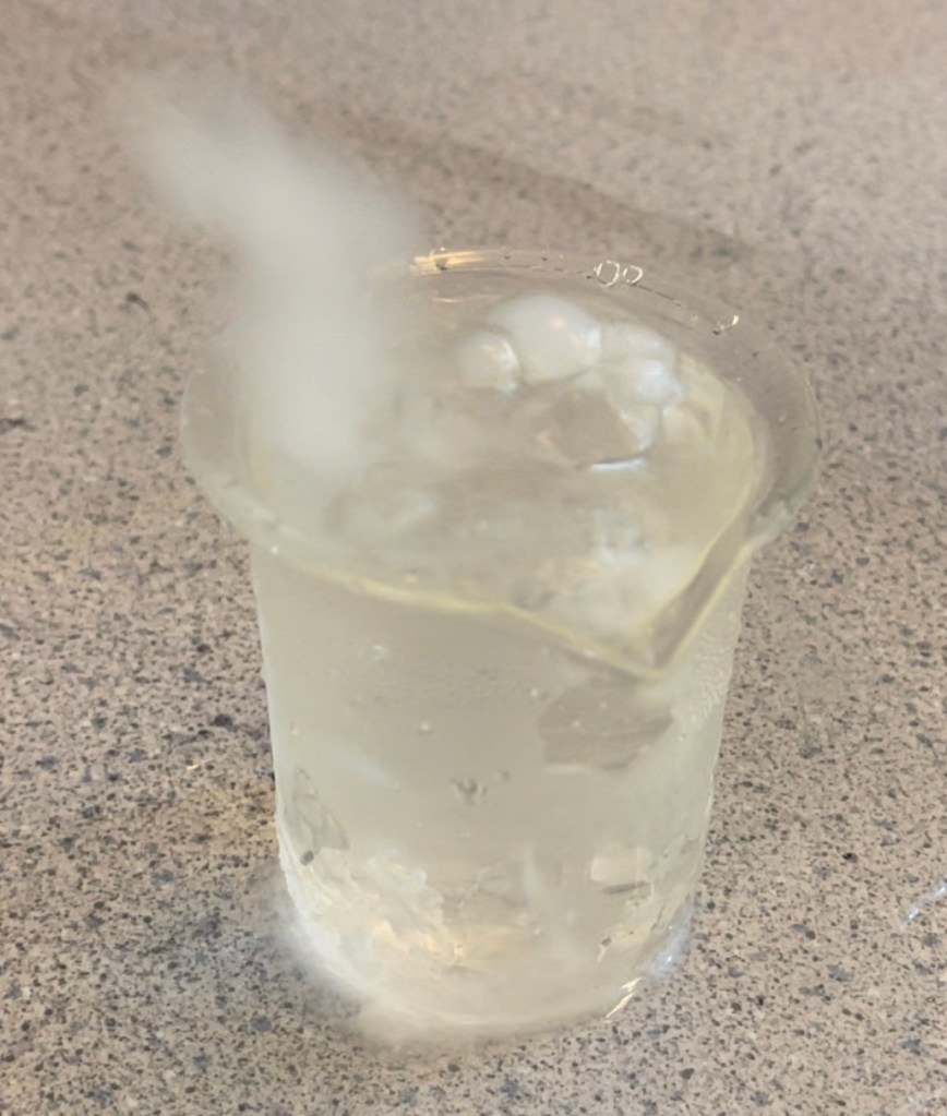 As well, students learned they should not directly touch the dry ice because at -78.5 degrees Celsius, it could cause frostbite (or a cold “burn”). However, as students experienced for themselves, the “smoky”, “steamy” puffs of gas that came off of the dry ice when it was covered in warm water were fine to touch. The gas felt slightly cooler than room temperature. In fact, this was a great example of what fog! (See the photo and graphic below to extend learning…)