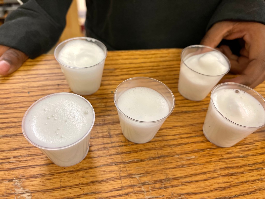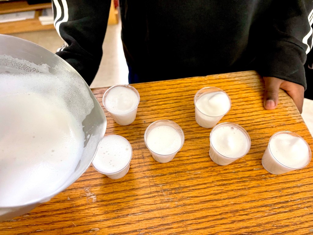 This morning we had a delivery of pears and milk as a part of the healthy food program. So, we spontaneously extended our “Bubble Science” learning and enjoyed the process of making caffeine-free, cinnamon lattes (apple cinnamon tea bag plus 2% milk)! We observed the aerating/stretching of the milk to form silky bubbles and remembered the role of fat and protein globules in maintaining the surface tension that forms bubbles.