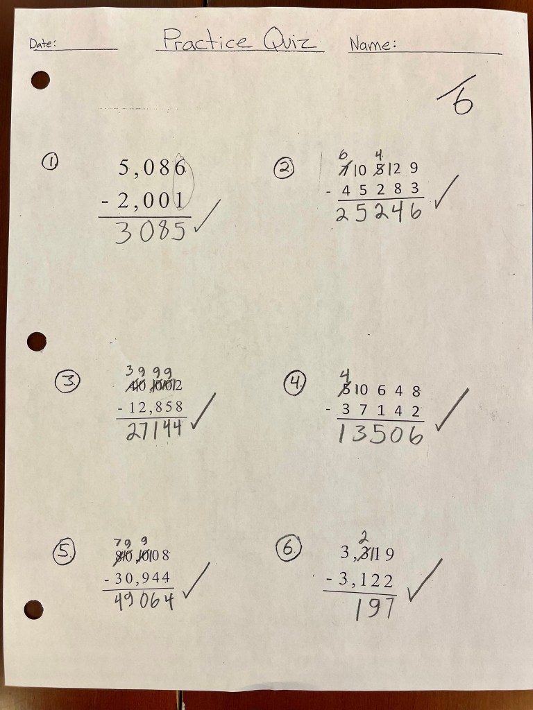 Today we did a “practice quiz” on subtraction. Students marked their own quizzes, and I demonstrated how to find each answer. Students brought home their quizzes to share with family today.
