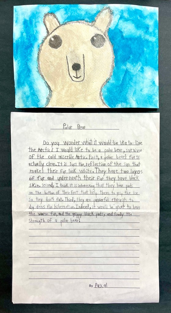 As described in a previous blog post, this project involved students in researching, brainstorming, writing multiple drafts, and editing with educator support. To support their growth as writers, students were given a list of assignment criteria and several full-in-the-blank frameworks to use or adapt, and they considered numerous good examples of animal paragraphs. Students self-assessed their own work against the criteria to help create writing goals for the future.