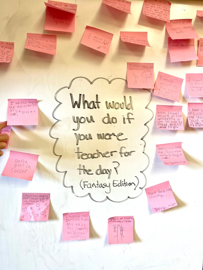 Our writing activity today focussed on this question: “What would you do if you were the teacher of our class for a day?” I invited students to be playful, and we called this writing challenge a “fantasy edition” where the limits of time and space do not have to apply.