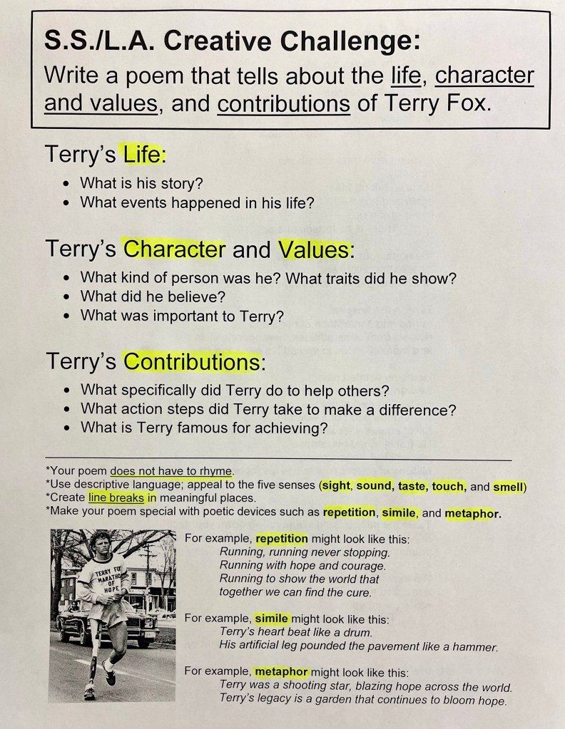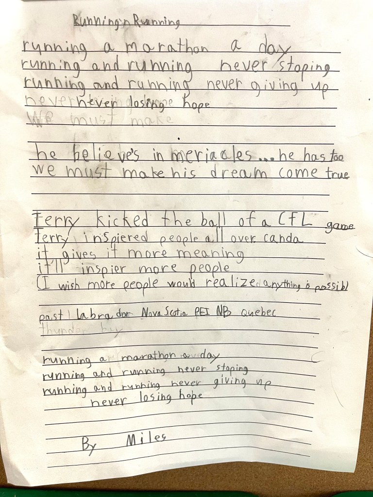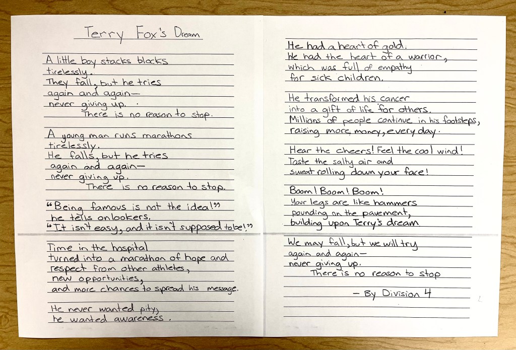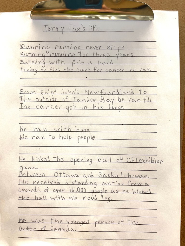 We spent time we exploring specific strategies for making our poems more interesting and creative. For example, we learned about how to use repetition, make meaningful line breaks, and use figurative language like simile and metaphor. This term, students will continue to work on these Terry Fox poems and revisit them with edits as they develop more tools as poets and editors.