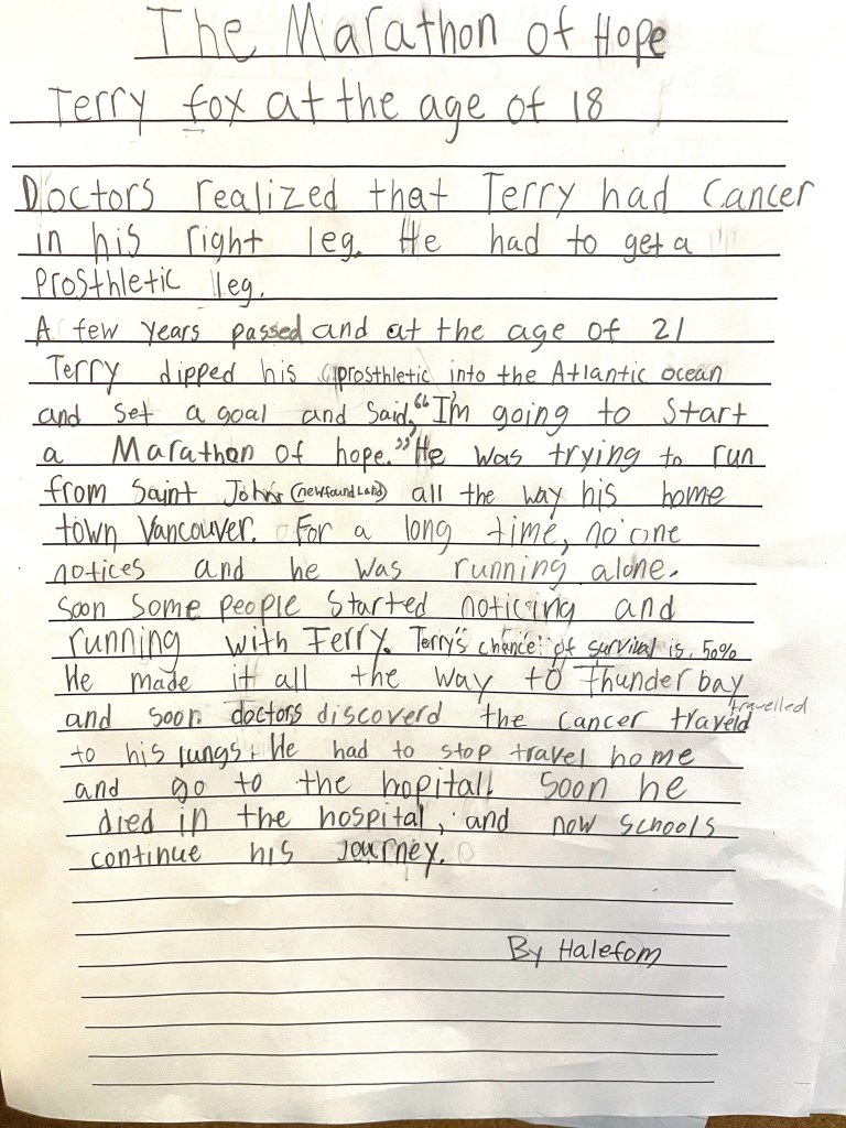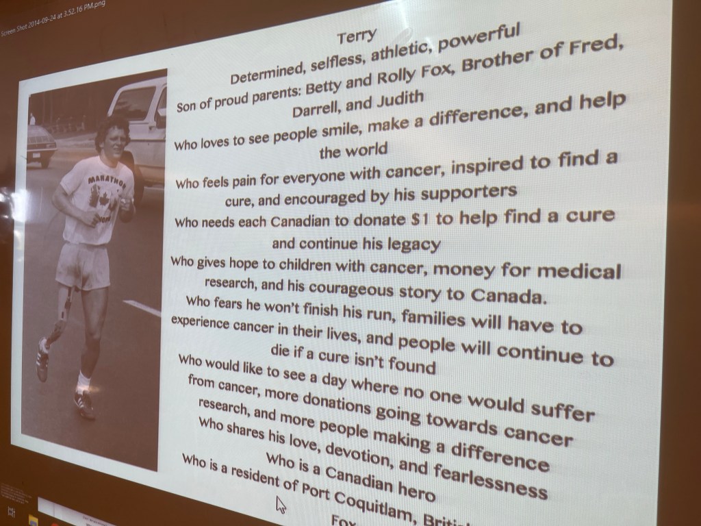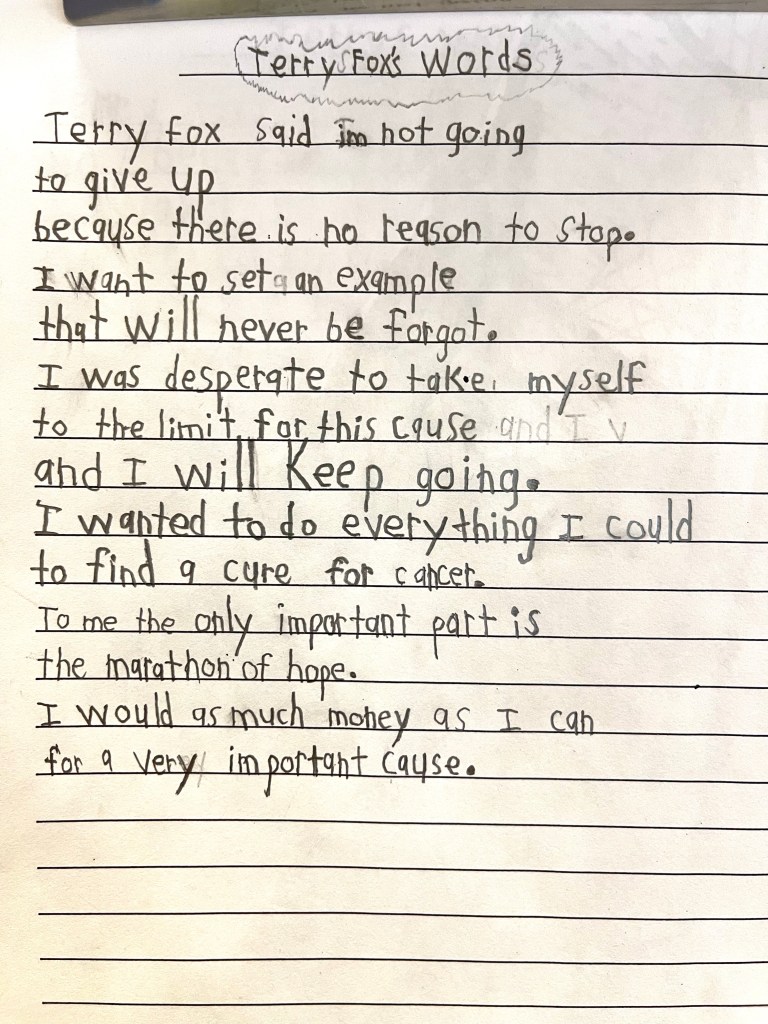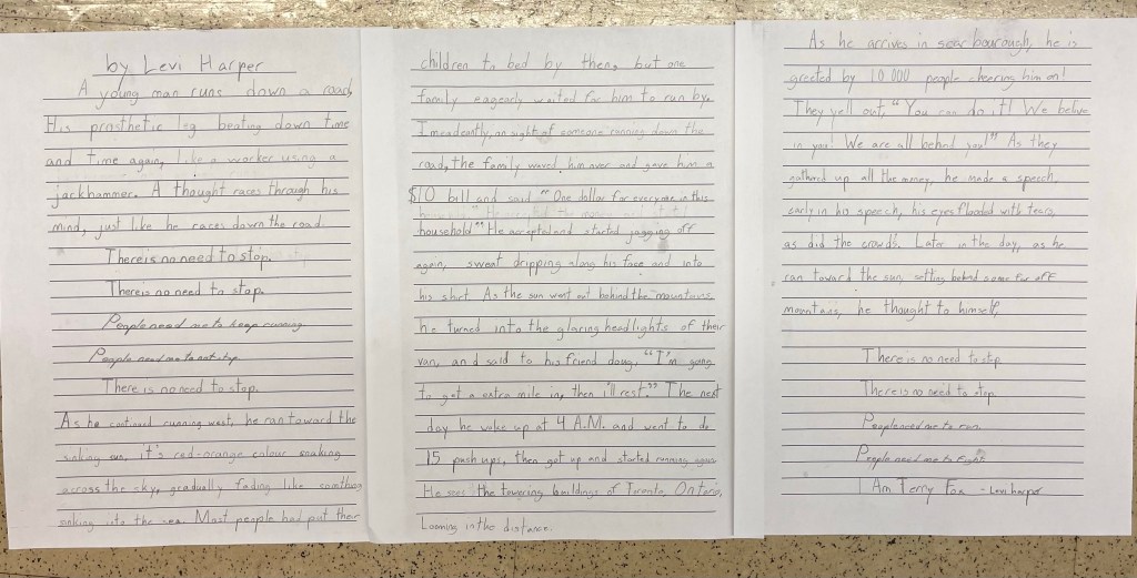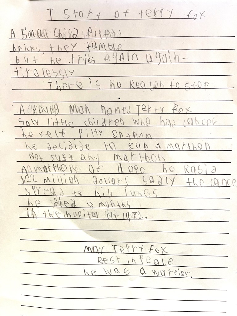 We spent time we exploring specific strategies for making our poems more interesting and creative. For example, we learned about how to use repetition, make meaningful line breaks, and use figurative language like simile and metaphor. This term, students will continue to work on these Terry Fox poems and revisit them with edits as they develop more tools as poets and editors.