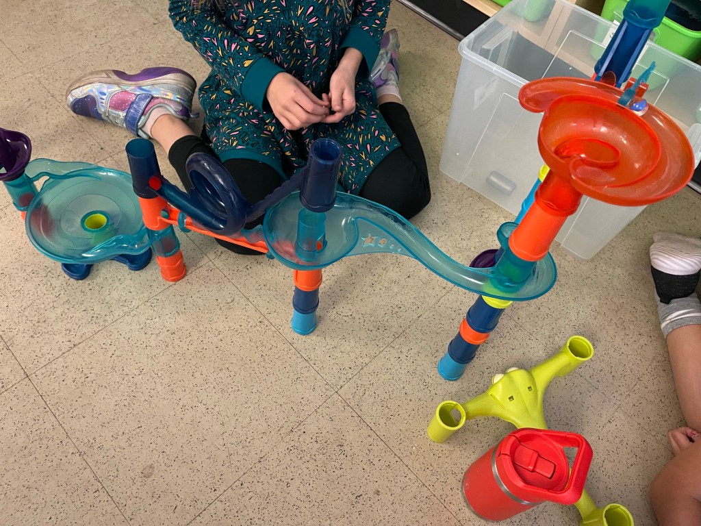 Here are some photos of the hands-on, collaborative arts and sciences activities they shared today including building a marble run, KEVA plank engineering, drawing, Megablocks constructions, toy vehicles, Lego, Story Studio (loose parts play), reading, and more.