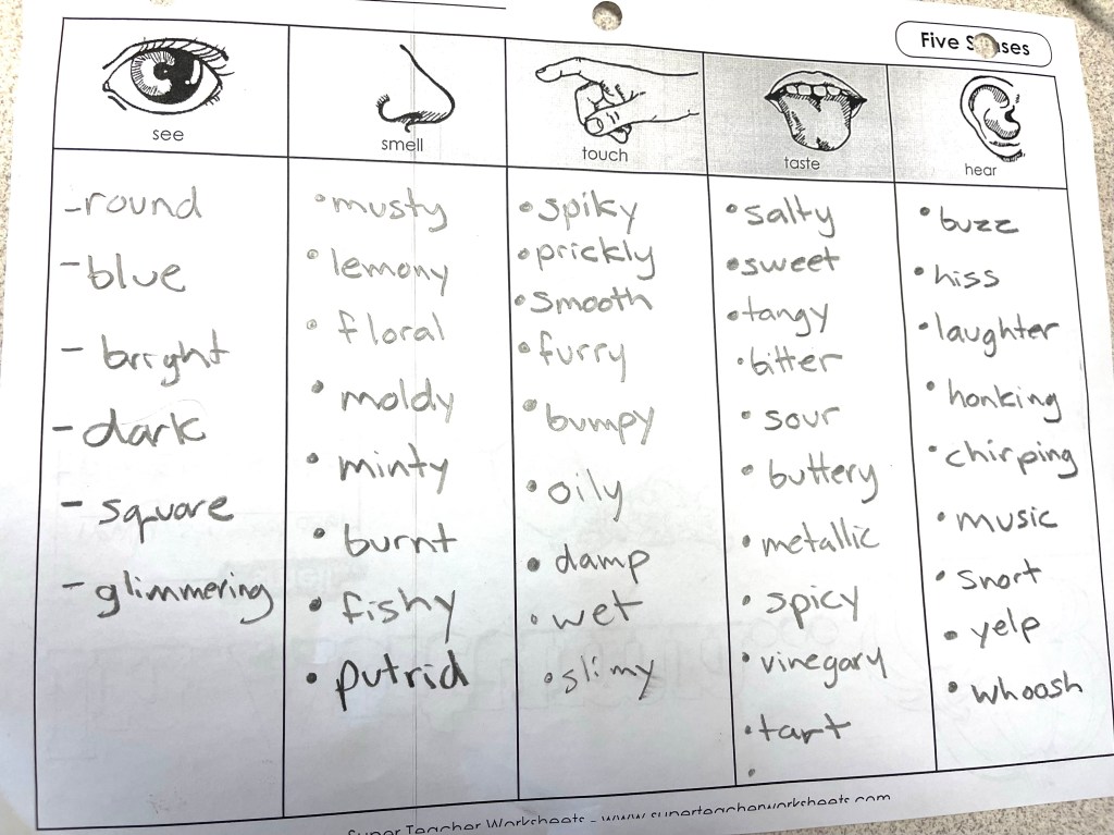 As we go further in our Language Arts writing lessons, we are practicing how to write descriptively through appealing to the five senses: sight, sound, taste, touch, and smell. Learning about the five senses is one of the Science curriculum goals this year as well.