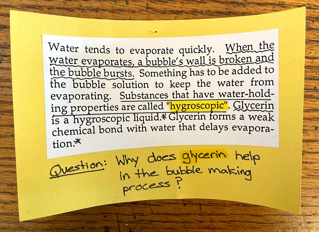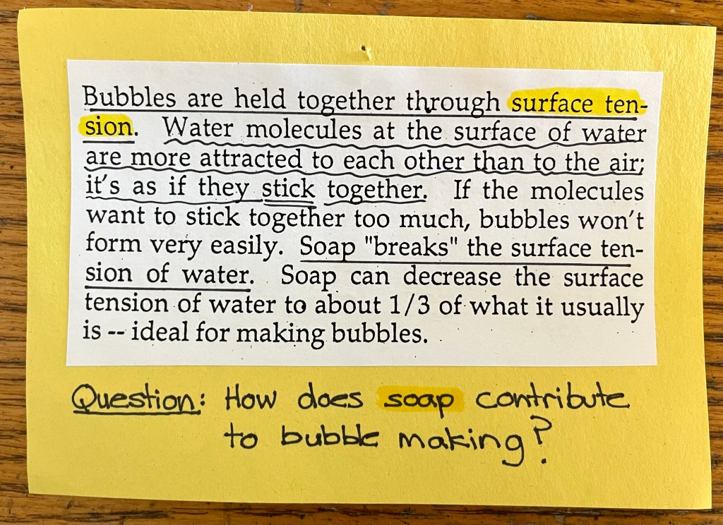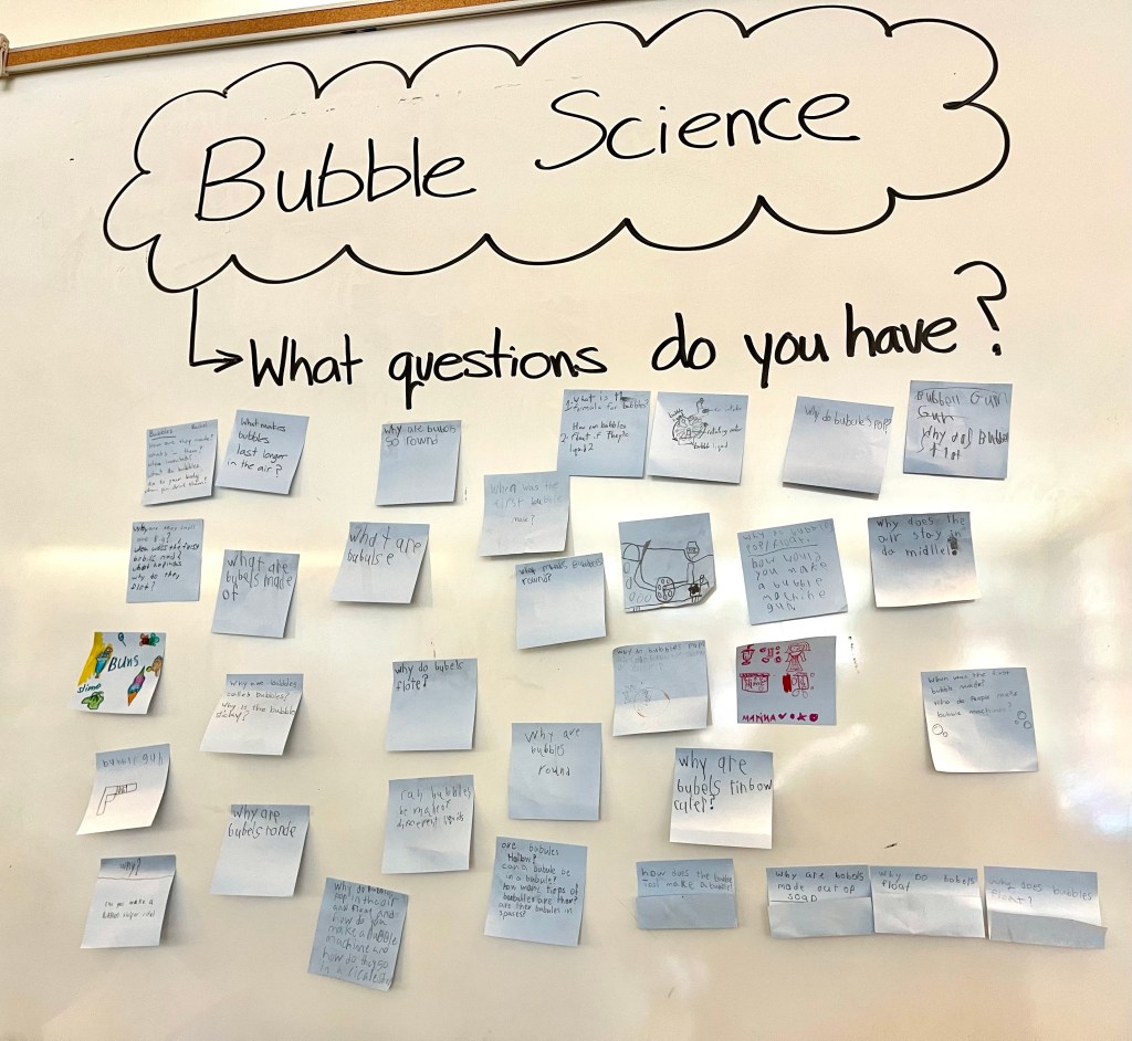 We began our learning with a group brainstorm of what we already know about bubbles. Then students jotted down all of the bubble-related questions they could conjure.