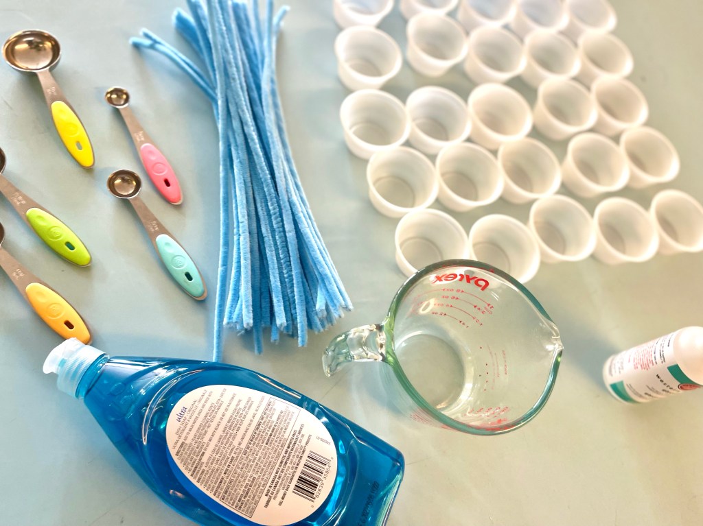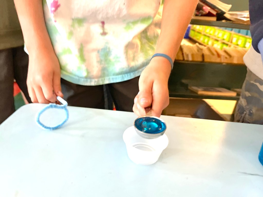 Then came the time to make and test our own bubble solution*. It was one part water (approx. 1.5 tablespoons) with a 1/2 teaspoon of glycerin. Students mixed their solutions and made bubble wands of various sizes with pipe cleaners. We discussed the importance of safe practices in science class. (I did need to mention, “Please don’t eat the bubbles.”)