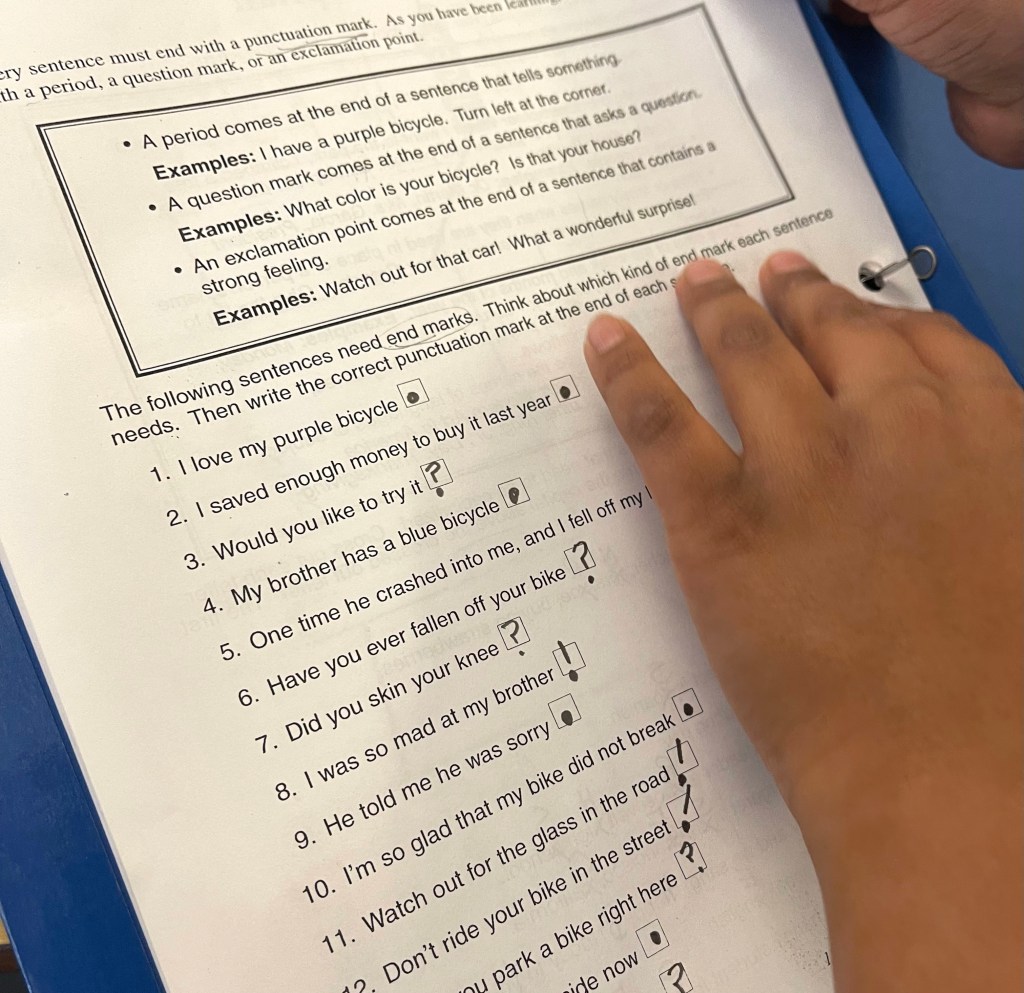 The students were challenged to transform examples of sentence fragments into creative topic sentences that had proper capitalization, grammar and punctuation.