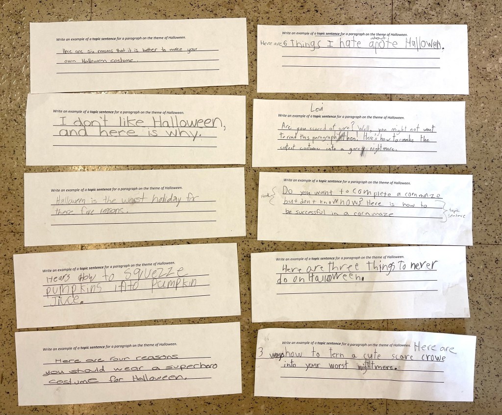 Next we drilled deeper down with a lesson on how to write a topic sentence. We discussed the purpose of a topic sentence as being to “highlight the main idea of a paragraph or essay, letting the reader know what the writing will be about.” The students wrote and shared their own examples.