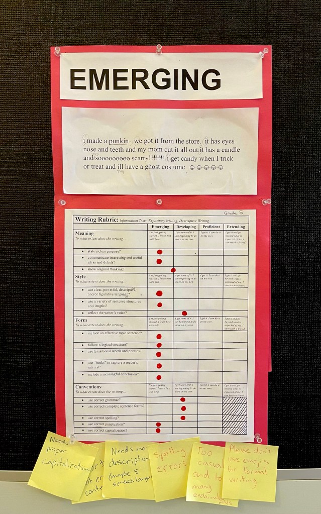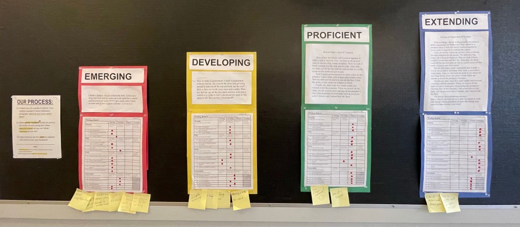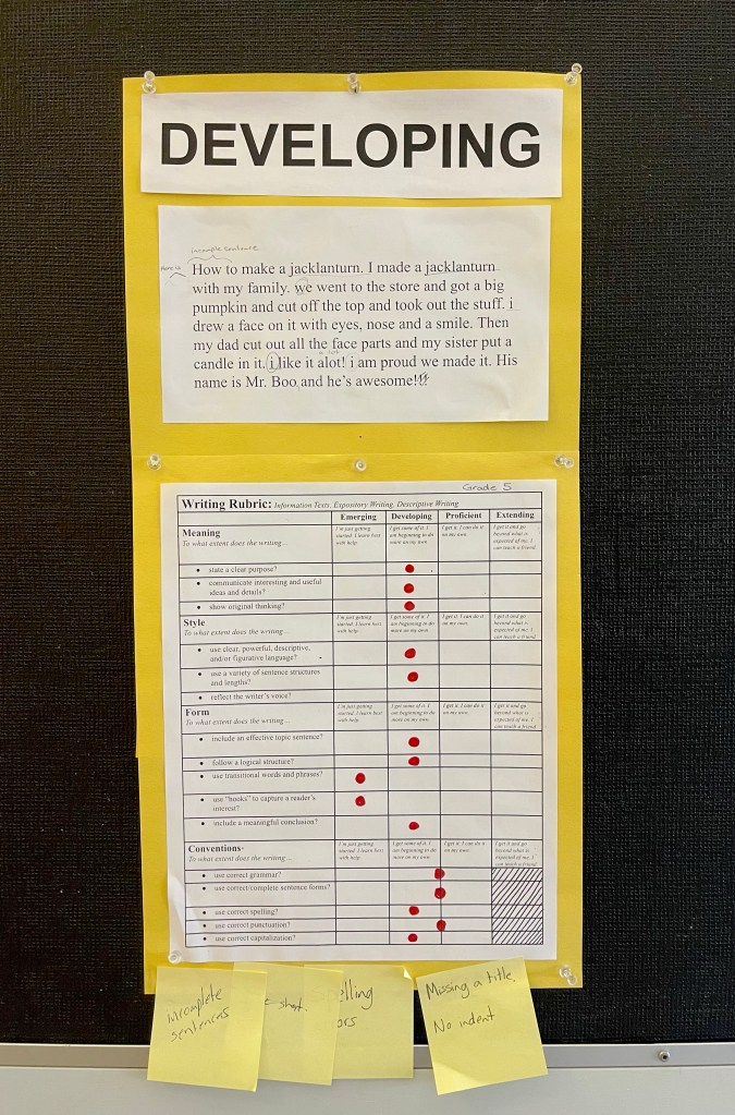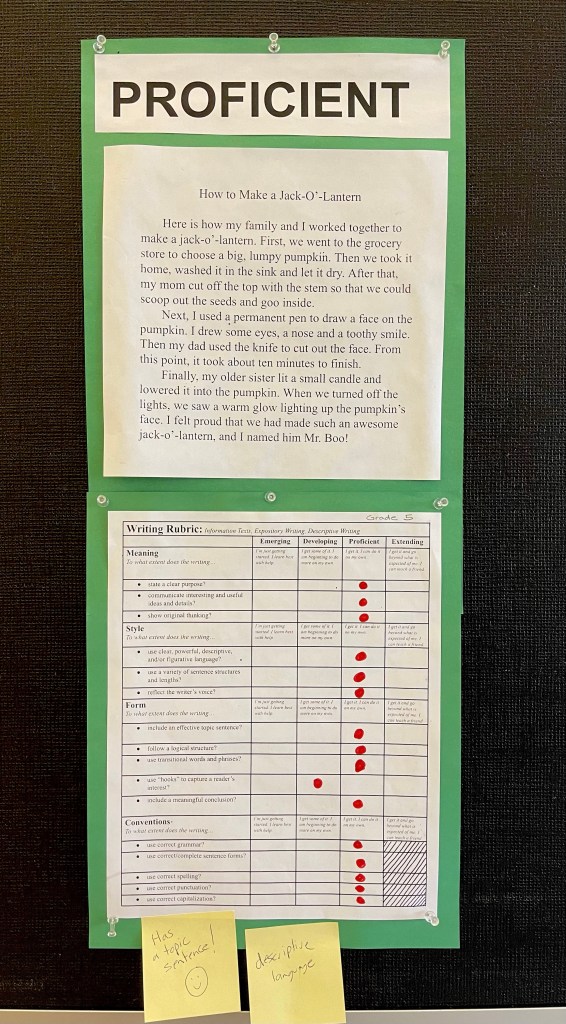 Together we are creating a bulletin display board based around an assessment rubric that clarifies specific differences between expository writing at an emerging, developing, proficient, and extending level. I will post more on this next week.