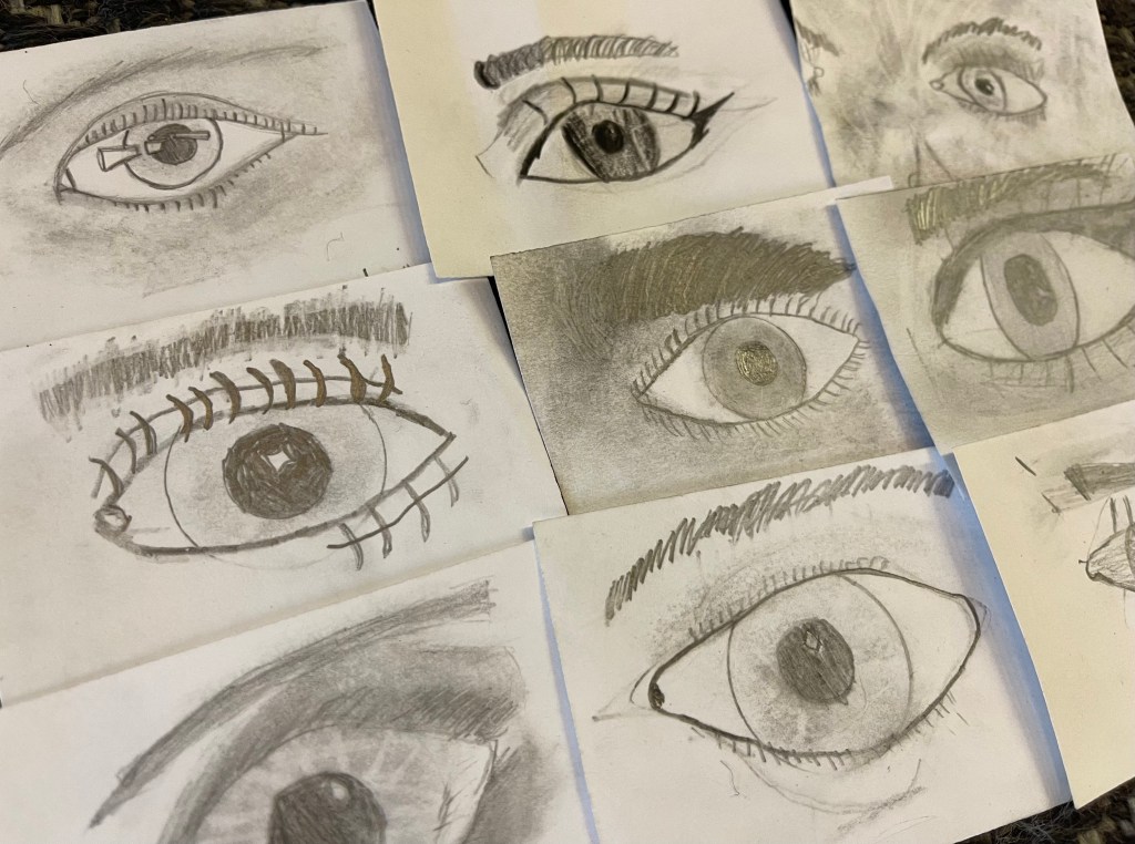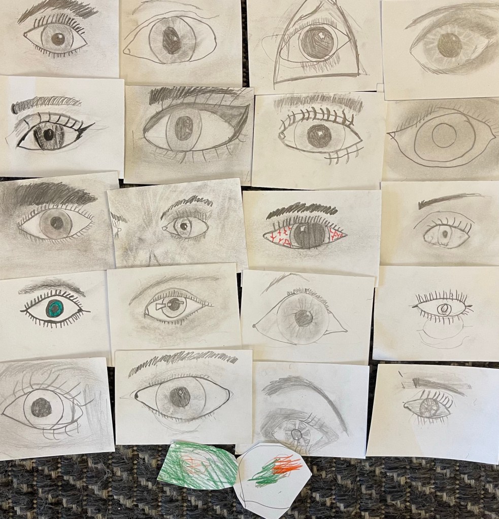 In Art class today, I taught students a technique for creating their own “smudgers” with torn paper. A smudger helps create soft edges and variation in tonal value when working in pencil. Connecting to our “five senses” learning, we spoke about the features and geometry of human eye. I modelled an example of how to draw a single eye, and invited students to try drawing their own.