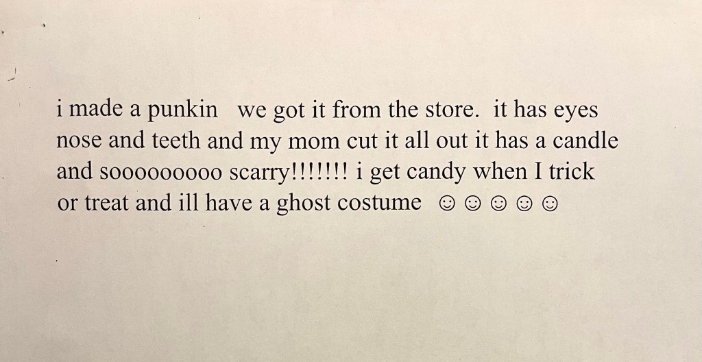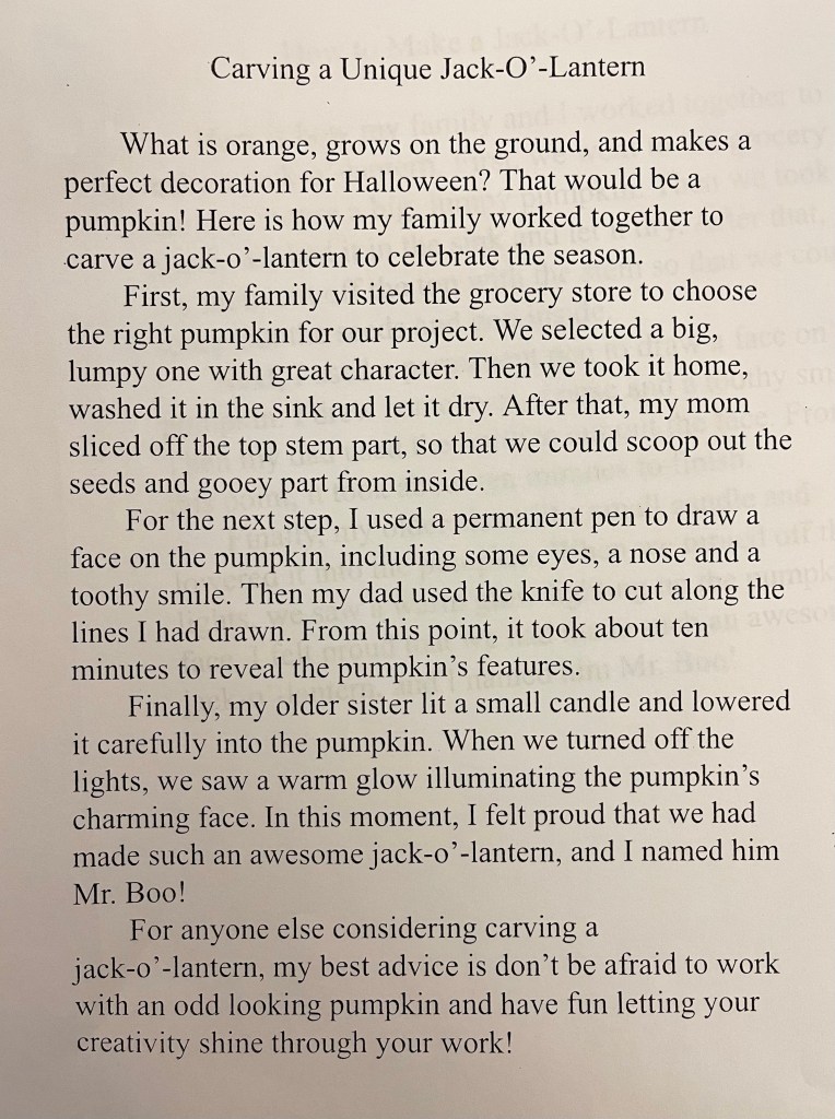 Building our skills as writers, we also introduced the concept of alliteration today. For example, the line “farmers’ fields are full of fresh pumpkins” is an example of alliteration because the beginning “f” sound is repeated.