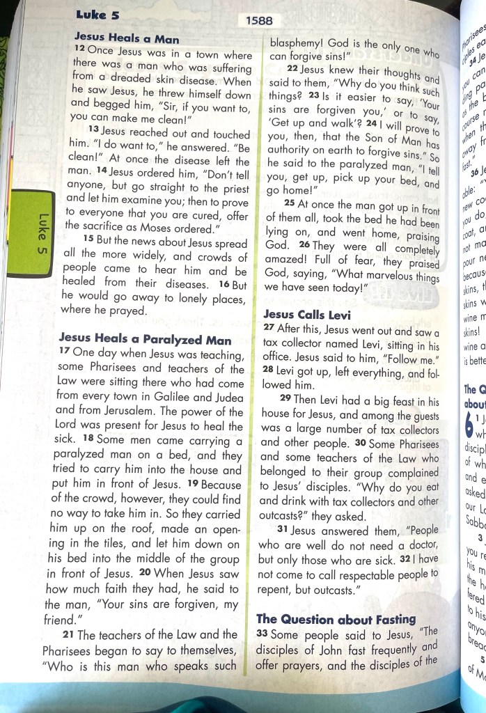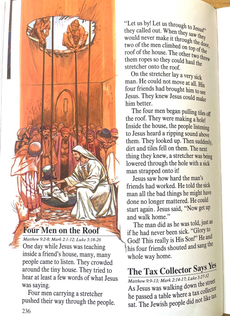 Part 4: We re-read and compared the original Bible story texts as they appear in Matthew 9:1-8, Mark 2:1-12, and Luke 5:17-26) AND notes their differences in various Bible translations.