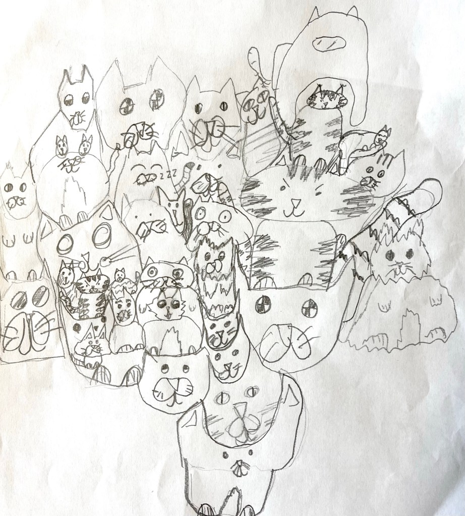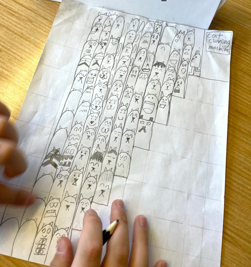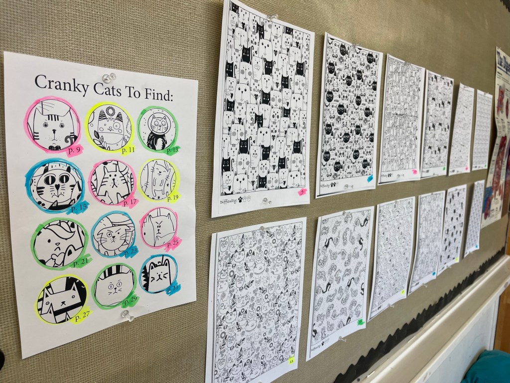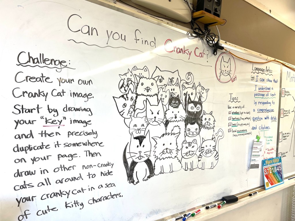Ask your child about “Cranky Cats”—we have been having a blast in Art recreating our own versions of this “Where’s Waldo”-style illustration.