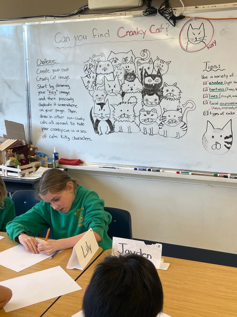 In Health Education this term, students have been exploring emotions and self-regulation strategies. One of our engaging projects was the Cranky Cat Search-and-Find creative drawing activity, where students created detailed illustrations and then wrote or told a creative story about a grumpy feline who learns to manage his emotions. Through the story, the cranky cat uses self-regulation strategies to transform his experience and outlook, with the encouragement and support of his fellow cat friends. This project allowed students to reflect on emotional awareness in a fun and meaningful way, reinforcing strategies they can use in their own lives.