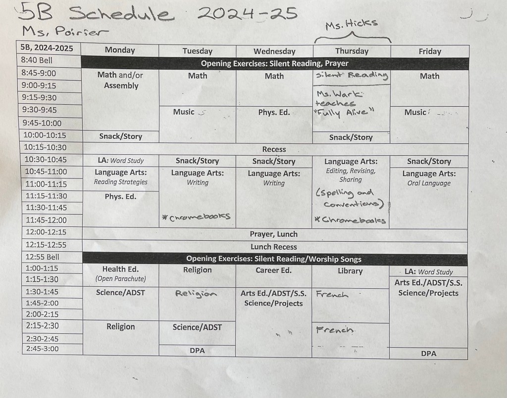 • Mrs. Catherine Hicks, our French teacher, will now be with 5B for the full day on Thursdays.