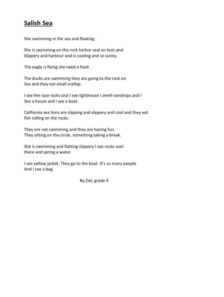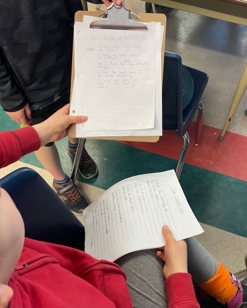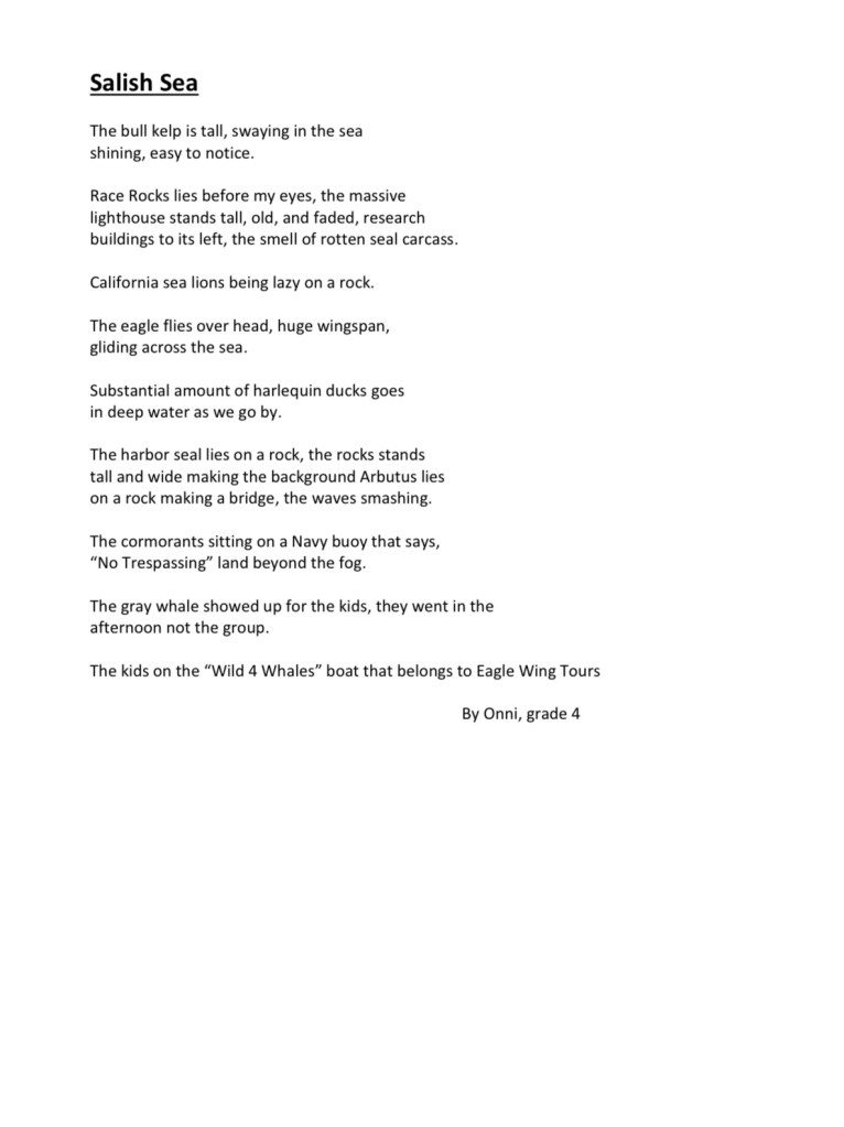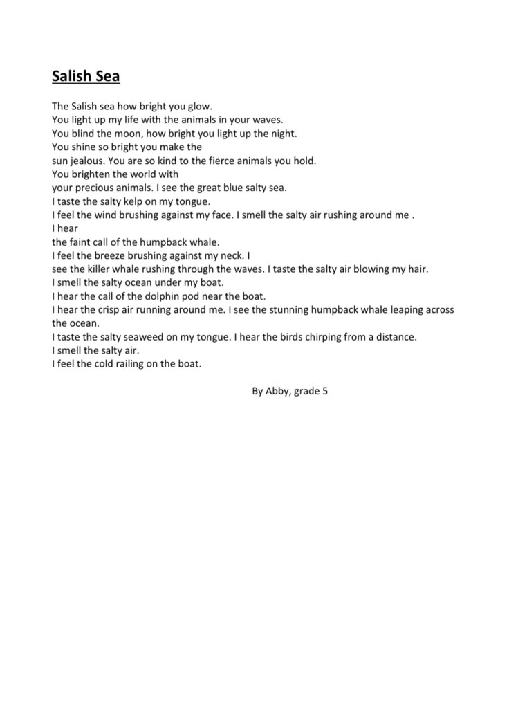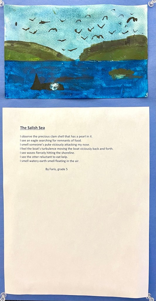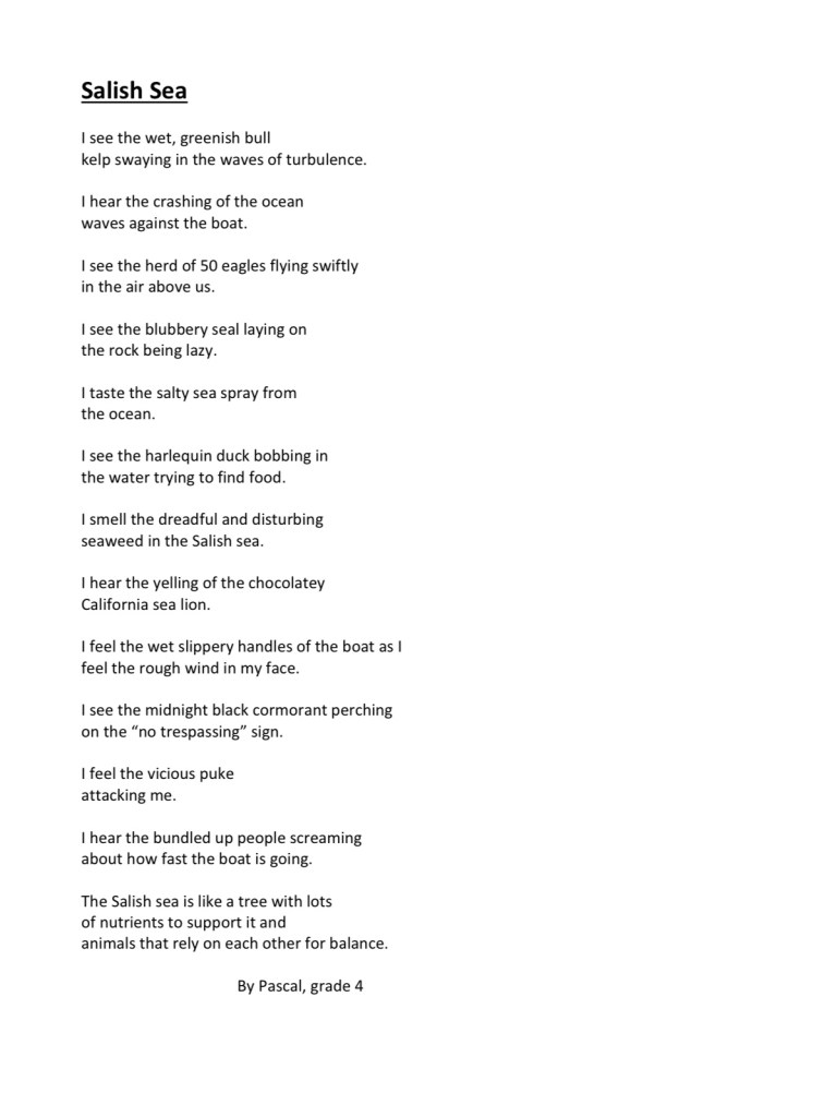 What do you see, smell, taste, hear, and touch when out on the Salish Sea? We have been working on “five senses” poems this term, and below is a selection of the best of our writing. Students wrote Salish Sea poems both BEFORE and AFTER their field trip out on the water—so we could compare how real life experiences could inform the creative process.