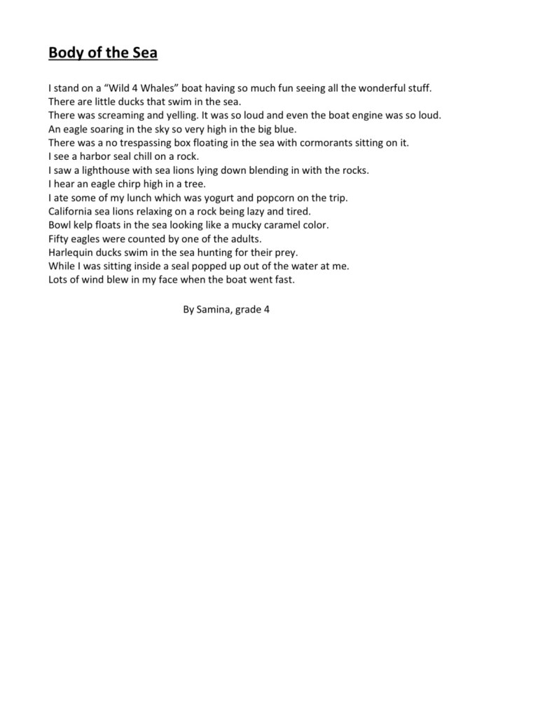 After receiving the wonderful photos from our trip aboard EagleWing’s “Wild 4 Whales” boat, the students each took some time to ponder all the images and write a few lines of poetry inspired by them in combination of their own memories. Then, as a class we reviewed and sorted the poetry lines to choose those lines that the students felt were the most powerful, interesting, and beautiful. We complied them into one big collaborative poem, which we present to you in the text below and video above.