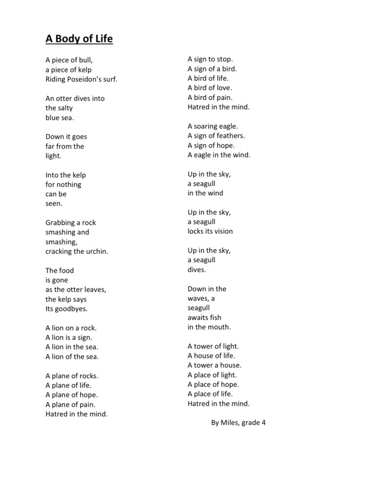 Applying poetic techniques helped students to create strong poems even before the boat trip. All term, students have been striving to make poetry with meaningful line breaks, alliteration, simile, metaphor, and rich, descriptive vocabulary. However, as you can read in the poems below, the most recent poems from Feb. 28 (created after the trip) seem to sing out in even more beautiful, sophisticated ways. I am so proud of our division 4 poets! We hope you enjoy this sample of some of this term’s poetic masterpieces…